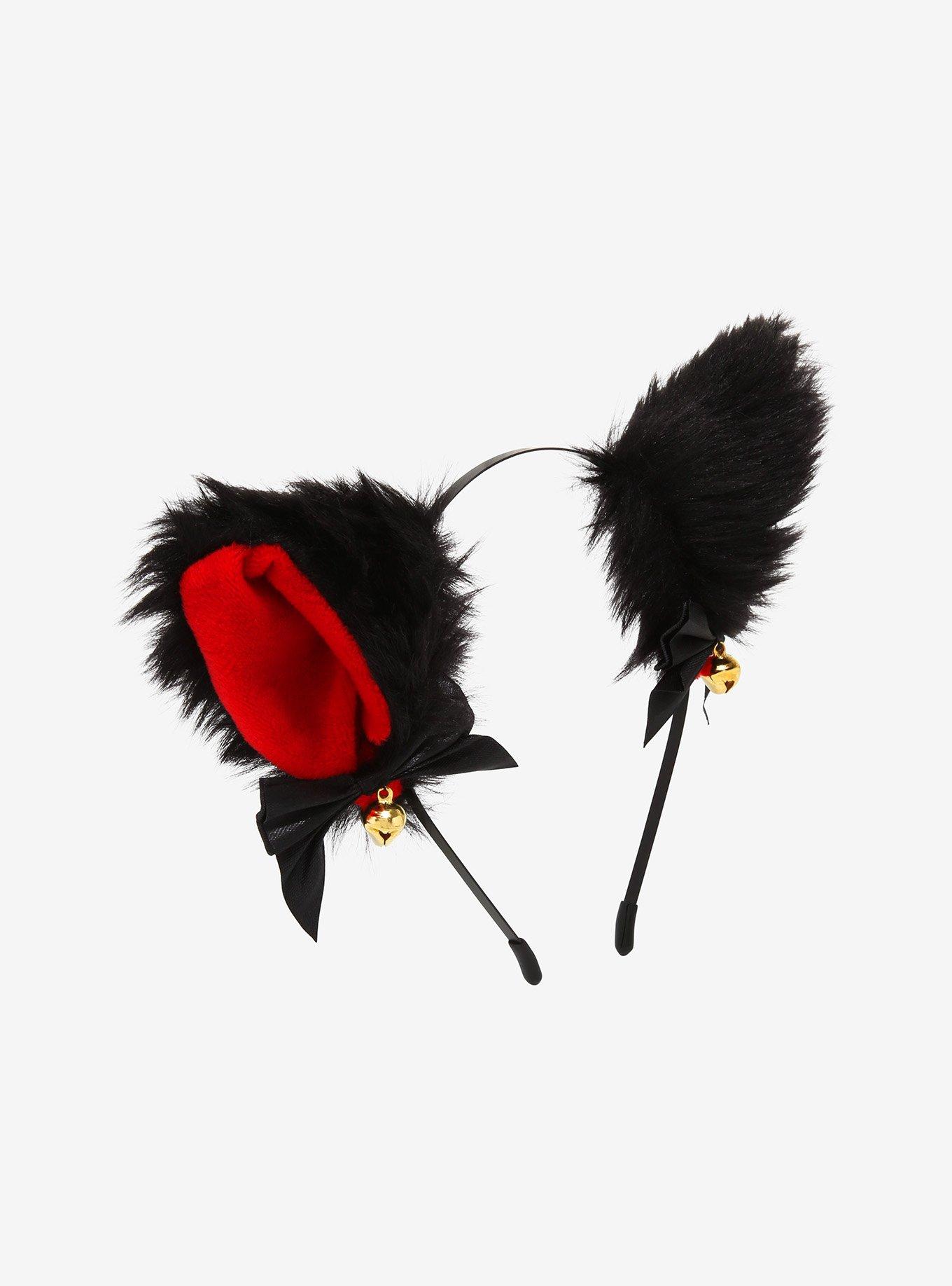 Black Red Ribbon Bell Fuzzy Cat Ear Headband Hot Topic